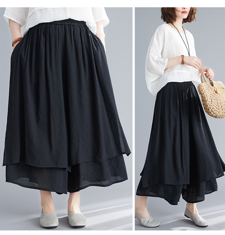 文学的な女性の夏の綿麻ワイドパンツ 無地9分丈ワイドパンツ